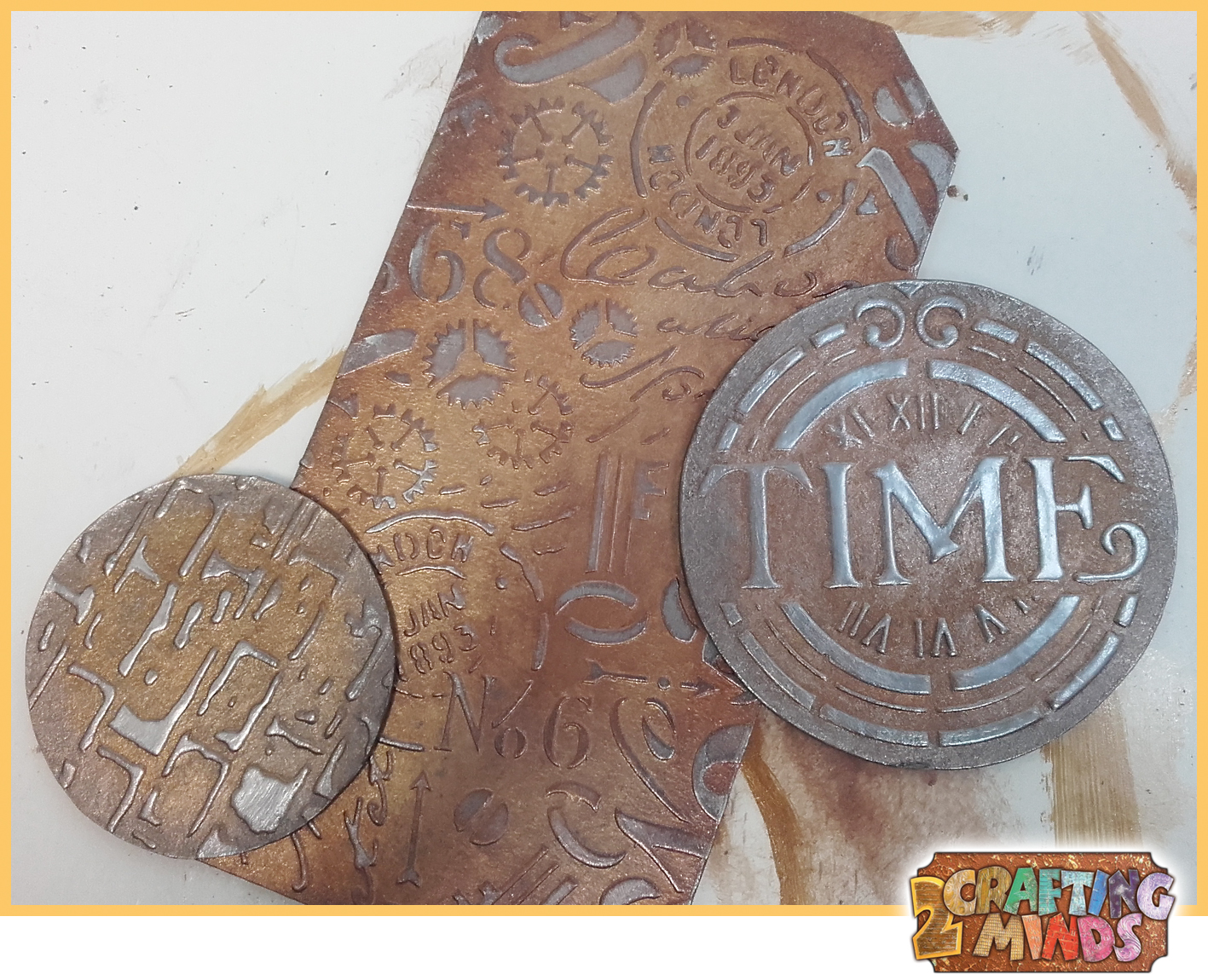 I applied the structure paste through 2 other stencils onto the 2 heavy duty circles I cut out and then distressed them in the same way as the tag.